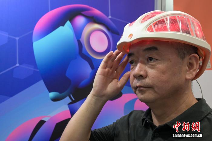 图片显示了参展商显示的石墨烯头盔,该头盔有效地缓解了头痛并改善了睡眠质量BYN,从而改善了新陈代谢和血液循环。照片中国新闻服务记者陈·杨诺(Chen Yongnuo)
